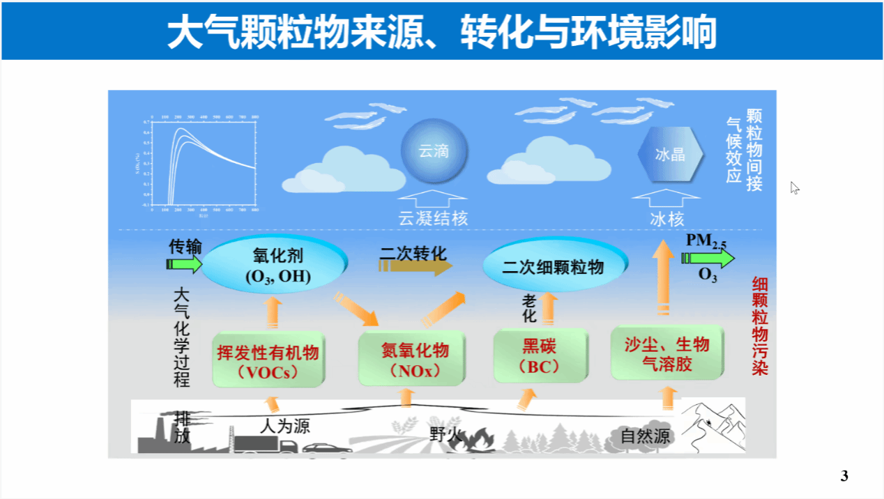 吴志军教授从大气颗粒物的基本物理化学特性入手,指出其粒径分布跨越四五个数量级,自纳米级直至微米甚至毫米级,不同粒径的颗粒物在化学组成、环境行为及健康与气候效应方面均存在显著差异。他强调,当前研究不仅关注一次排放,更加重视大气中的二次转化过程——在适宜环境条件与氧化剂作用下,颗粒物通过多相界面反应生成二次组分,成为PM2.5和臭氧复合污染的关键成因。此外,颗粒物通过影响云凝结核和冰核活性,显著改变云微物理过程及气候效应,也是研究的重点方向。