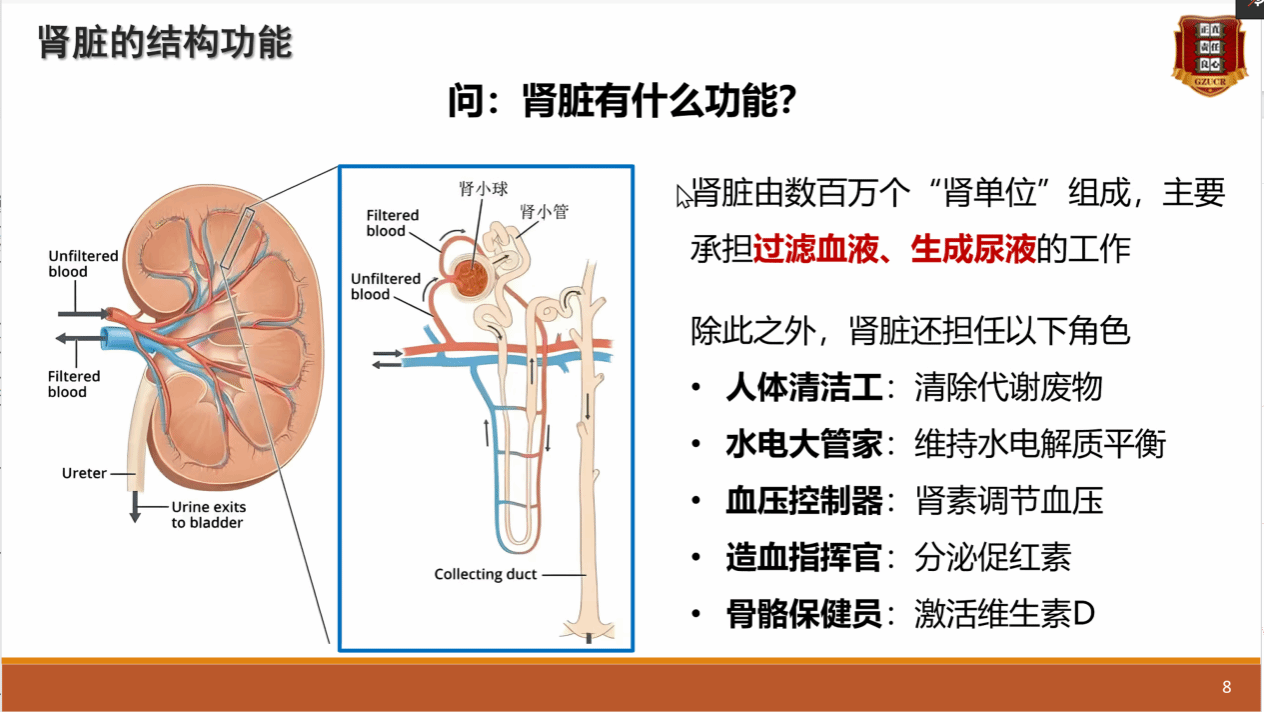 钟教授以通俗易懂的语言讲解了肾脏的功能、常见疾病及保健方法。肾脏位于脊柱两侧,大小如拳头,正常情况下无法触摸,若能摸到可能提示积水、肿大或肿瘤等异常。西医视肾脏为精密器官,承担多重功能:它像“清洁工”过滤血液,排出代谢废物形成尿液;如“水电解质管家”调节水及钾、钠、钙等元素,维持酸碱平衡;还通过水量及激素控制血压,分泌促红细胞生成素助力造血,并激活维生素D促进骨骼健康。中医则将肾视为“先天之本”,涵盖水液调节、生长发育及生殖功能,体现于尿频、精神状态及头发光泽等方面。