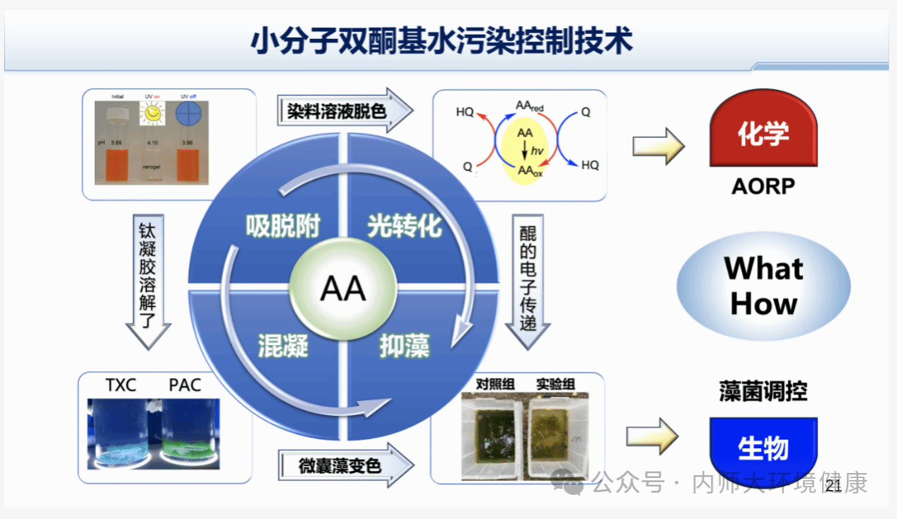 张教授团队取得了系列创新成果:开发了基于钛凝胶的新型材料,其特有的光致吸附-脱附机制实现了染料污染物的动态去除;在生物污染控制领域,发现小分子双酮可特异性调控藻类光合电子传递链中的醌类物质,对蓝藻(如铜绿微囊藻)表现出显著抑制效应,而对绿藻则呈现低浓度促进作用,这种“高抑低促”特性为藻菌系统的协同调控提供了新思路。