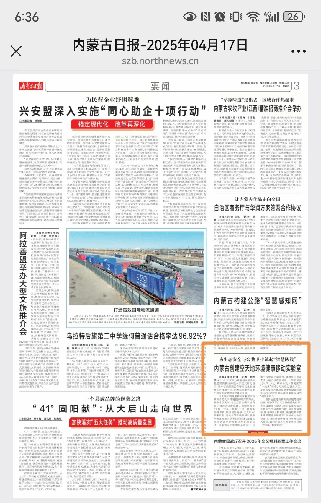 为落实好习近平总书记交给内蒙古的“五大任务”,服务好国家、自治区科技创新战略发展,4月16日,内蒙古师范大学环境健康研究院创新联合集成创建的“空天地环境健康移动实验室”正式启动。中国工程院院士、中国环境科学研究院副总工程师、环境基准与风险评估国家重点实验室主任吴丰昌,内蒙古自治区科学技术厅党组书记、厅长张文韬,内蒙古师范大学党委书记李树林,党委副书记、校长张军,内蒙古农业大学党委副书记董贵成,内蒙古师范大学副校长贾美林等出席启动仪式。内蒙古自治区科学技术厅、内蒙古自治区疾病预防控制局、科技日报等相关单位负责同志,以及国内多所高校和科研机构的专家学者齐聚现场,共探边疆生态健康监测新路径。