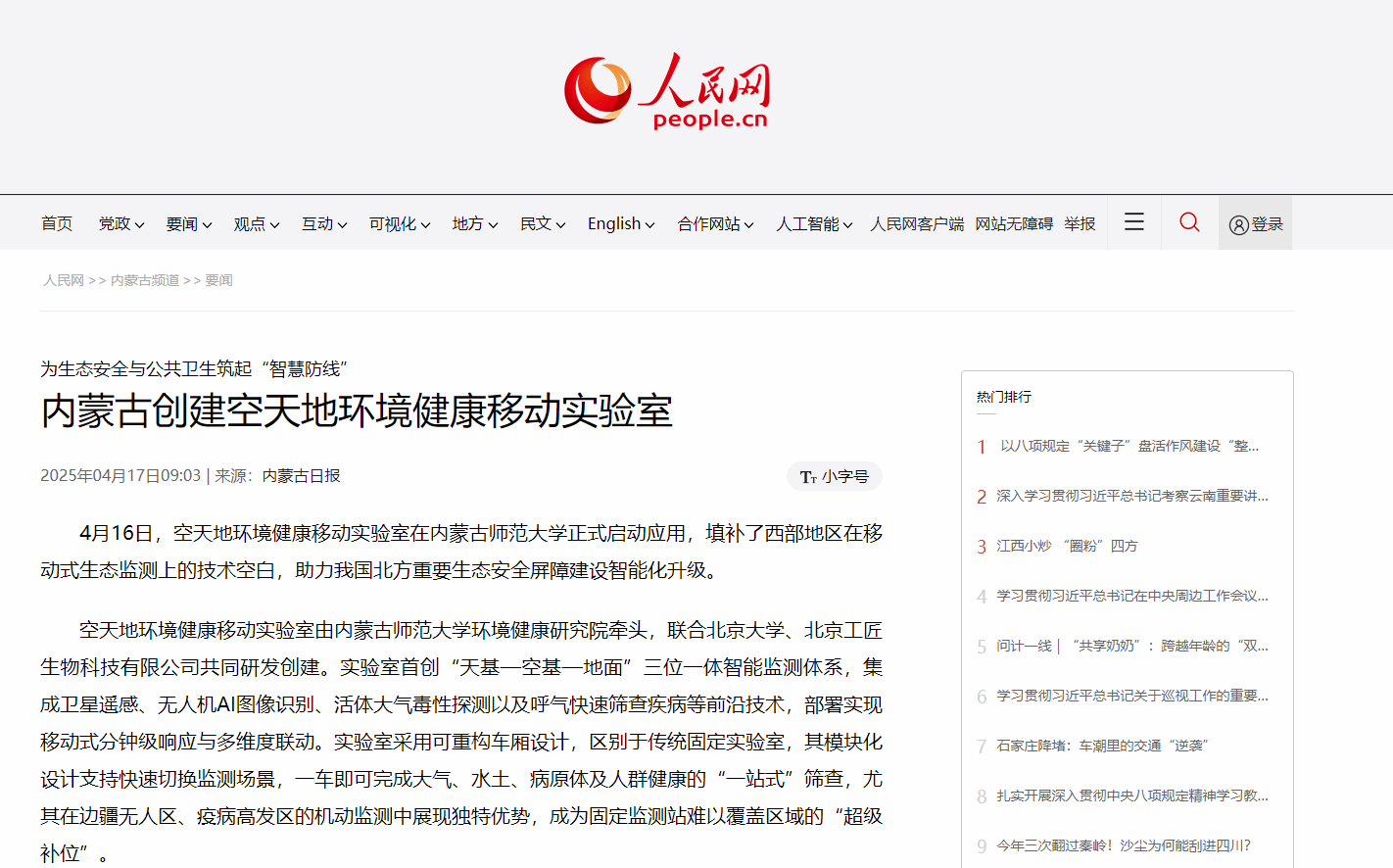 该实验室由内蒙古师范大学环境健康研究院牵头,联合北京大学和北京工匠生物科技有限公司共同建设。首创“天基-空基-地面”三位一体智能监测体系,集成卫星遥感、无人机AI图像识别、活体大气毒性探测以及呼气快速筛查疾病等前沿技术为一体,部署在移动平台,实现移动式分钟级响应与多维度联动。该平台突破传统实验室时空限制,可全域覆盖内蒙古边疆地区,低成本实时监测大气污染跨境传输、鼠疫疫情预警、快速筛查人群健康以及布鲁士杆菌等病原体感染检测、水土生态健康评估等关键问题,实现了环境健康研究的新范式。