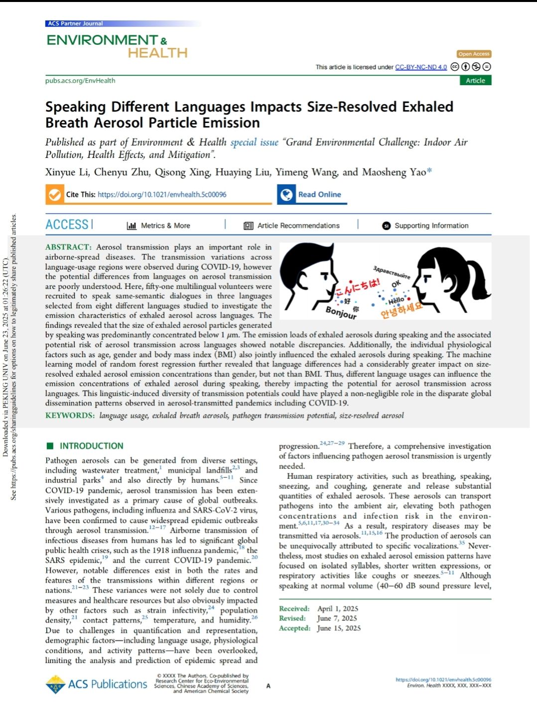 ACS E&H封面文章:不同语言影响呼出气溶胶排放